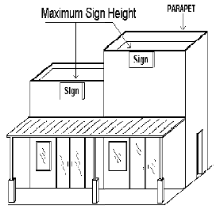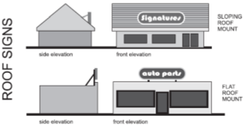 Roof sign: A sign projecting to a greater height than the front building wall, or any sign supported by or attached to a roof, including a sign painted on or adhered to a roof.
