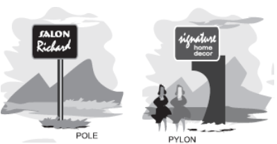 Pole or pylon sign: A sign that is mounted on a freestanding pole or poles, columns, or similar support such that the bottom of the sign structure is not in contact with the ground along the entire portion of the sign face. A pole or pylon sign is distinguishable from a monument sign.