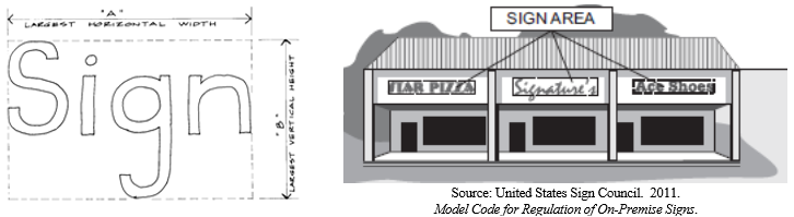 The relationship of sign characteristics (area and height, for example), especially wall signs, to the building on which it is attached is very important in terms of aesthetics. Without regulation, signage placed on walls can be too large in proportion to the building facade. Similarly, sign codes need to accommodate the differences in size, scale, and height of different buildings. For instance, if an absolute maximum sign area is established, it may be appropriate proportionally for a certain size of building but inappropriate (too small and also out of proportion) to a very large building. For this reason, it is appropriate to regulate wall signage on the basis of the percentage of area of the building facade. Similar, a proportionality regulation is considered appropriate for window signage. An industrial establishment, with large wall areas, does not have the same needs as a commercial establishment in this regard and is appropriately limited to a smaller percentage of wall area used for signs and advertising than a commercial establishment.