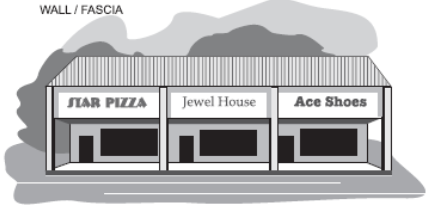 Wall sign locations. Appropriate locations for wall signage on buildings with more than one story shall be in the lintel space which separates the storefront from the upper floor, and the space above the transom in the storefront, where one exists. Wall signs should be located on flat, unadorned parts of the building facade, somewhere above storefront display windows (where they exist) and below second-story windows (where they exist). If the building facade or storefront has a lintel strip or signboard, the wall sign should be placed directly on it. Wall signs should be located centrally on the facade.