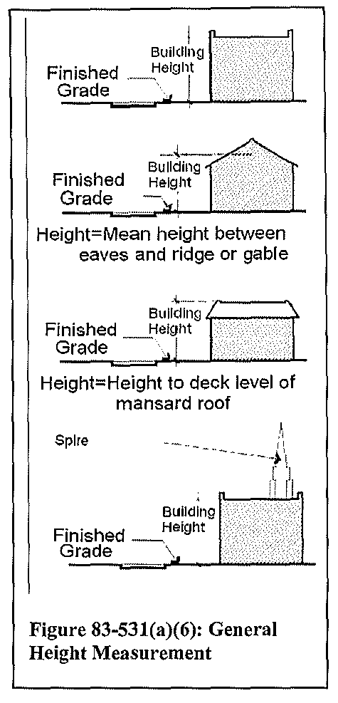 Structure height. The height of a structure shall be determined by measuring the vertical distance from the average elevation of the existing finished grade at the front of the structure to the top of the roof for a flat roof, to the deck line for a mansard roof, or to the mean height between eaves and ridge for a gable, hip, cone, gambrel, or shed roof.