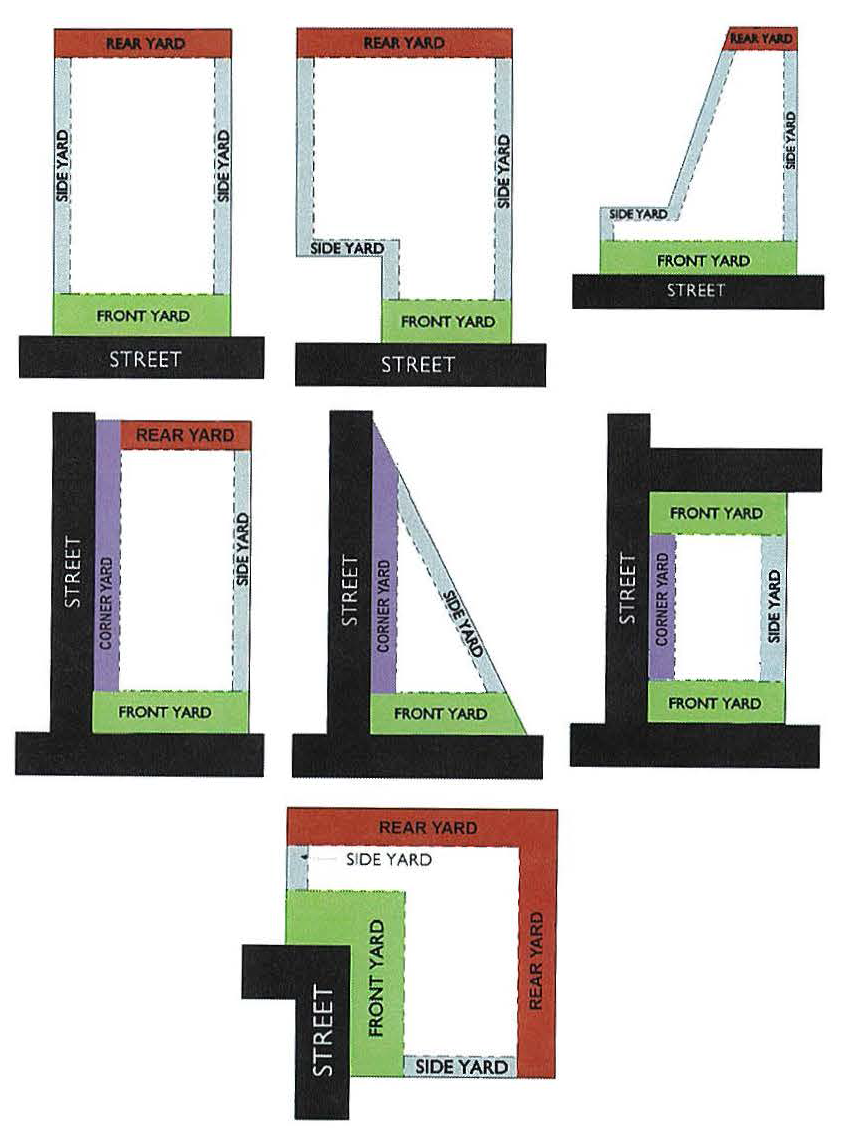 Generally. Front, side, and rear yard depths on a lot shall be determined by measuring the horizontal distance along a straight line extending at a right angle from the lot's front, side, or rear lot line (as appropriate) to the foundation of the nearest structure on the lot. (See figure 83-531(a)(7)a.: Lot shapes and yards) Allowable encroachments into required yards shall be ignored when measuring yard depths (see section 83-531(b)(5), Allowable encroachment into required yards).