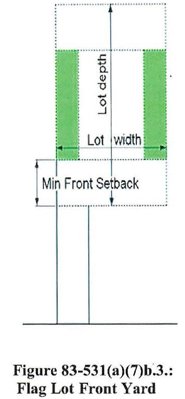 Flag lot. On a flag lot, the front yard depth shall be measured—and the minimum front yard depth applied—within the "flag" portion of the lot, from the lot line delineating the base of that portion. (See figure 83-531(a)(7)b.3. Flag lot front yard.)