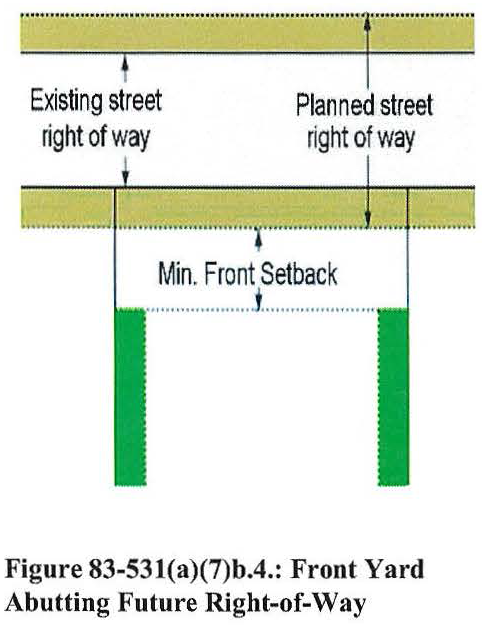 Measured from future street right-of-way. Where county-adopted plans call for the future widening of the street right-of-way abutting a lot and identify the future right-of-way boundary (e.g., by delineating the boundary or establishing its distance from the street's centerline), the front yard depth shall be measured—and the minimum front yard depth applied—from the future right-of-way boundary. (See figure 83-531(a)(7)b.4.: Front yard abutting future right-of-way.)