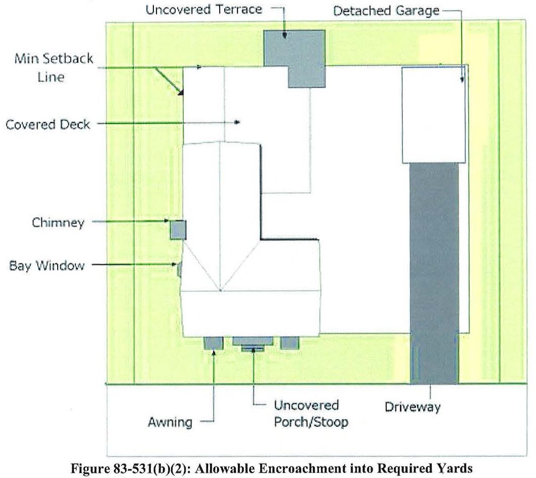 Allowable encroachment into required yards. Every part of every required yard shall remain open and unobstructed from the ground to the sky except as otherwise allowed in table 83-531(b)(5), Allowable encroachments into required yards, or allowed or limited by provisions in Article VII: Use Standards, Article VIII: Development Standards, or elsewhere in this Code. (See figure 83-531(b)(2): Allowable encroachment into required yards.)