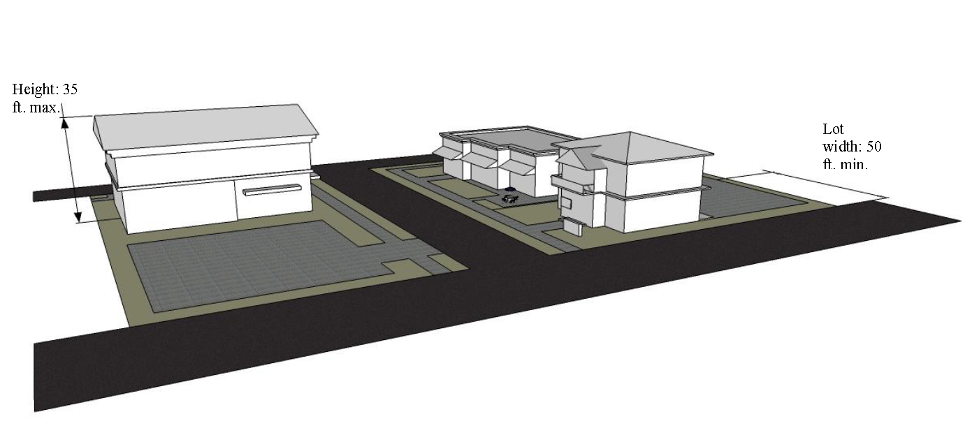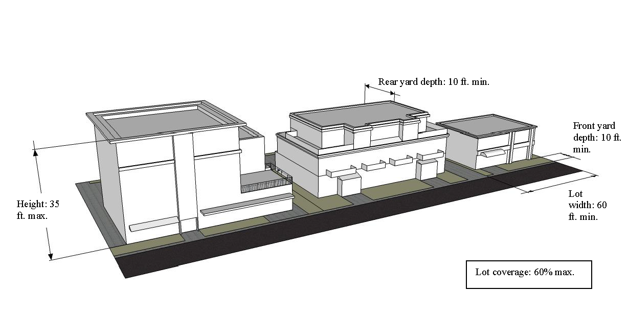Promote the mixing of low-speed vehicular traffic and pedestrian activity along human-scale streetscapes;