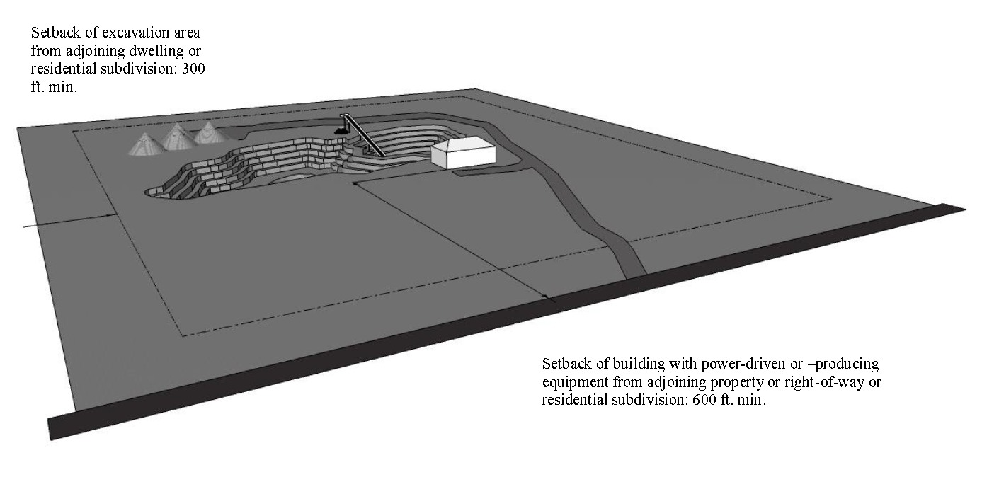 Minimum buffers and/or setbacks from adjoining residential development or residential zoning districts, from adjacent farm operations, and from environmental features such as watercourses and wetlands.
