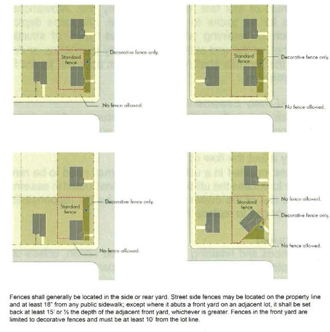 Diagrams depicting the location of fences on various types of lots are attached at the end of this chapter.