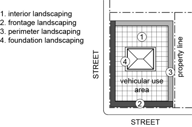 Foundation Landscaping. Treatment of grade, ground cover, vegetation and ornamentation between the principal structure and the vehicular area. See Figure 10-1.