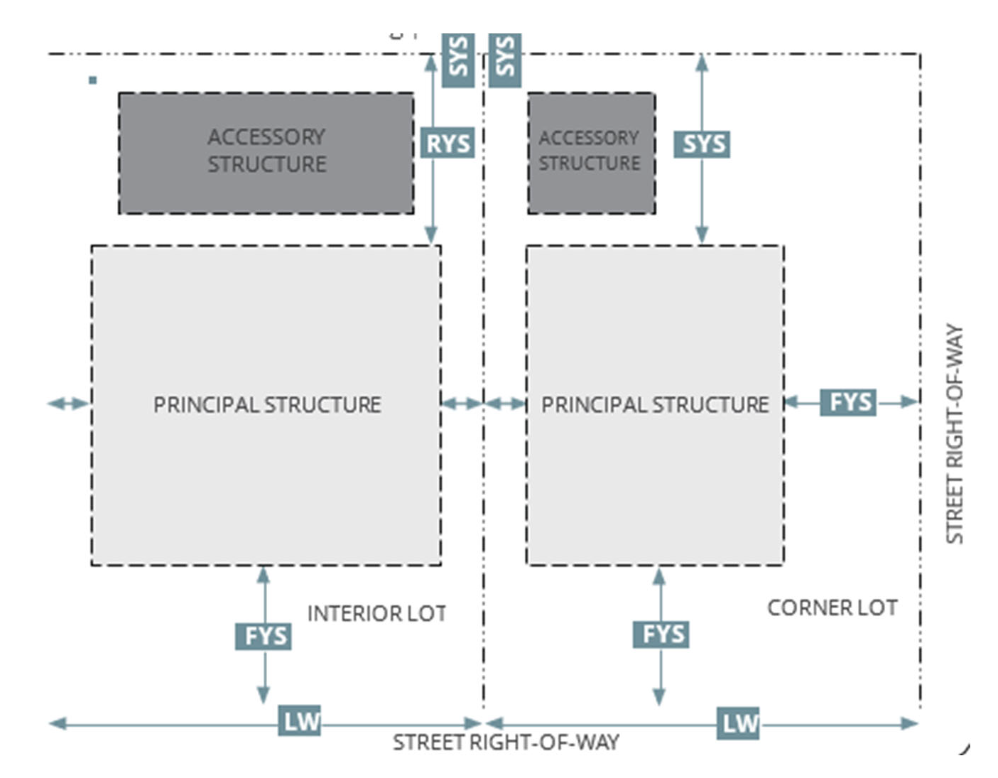 Front yard setback. A front yard setback is the shortest horizontal distance between a structure and the edge of the right-of-way (see Figure 3). FYS
