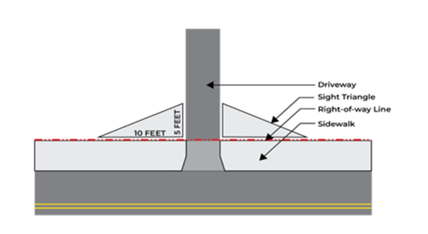 Clear visibility triangles shall be created and maintained according to the following standards: for driveways that intersect with sidewalks, the area of property on both sides of a driveway formed by the intersection of each side of the driveway and the public right-of-way line for a distance of ten feet in length and five feet in width along the public right-of-way shall be kept clear. (See Figure 5)