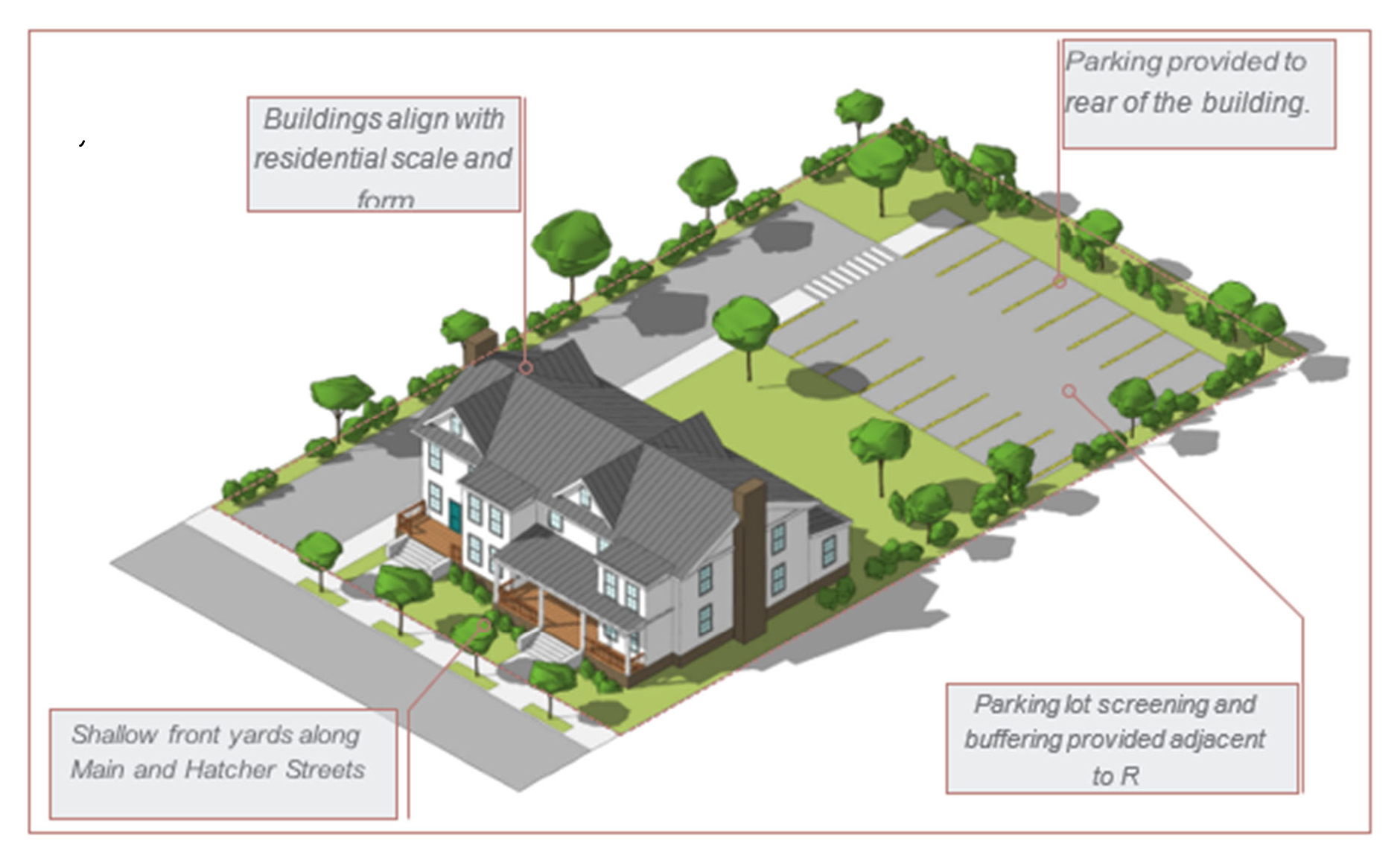 Throughout this section, distinctions are made for buildings fronting Hatcher Street, and to the north or south of Main Street.
