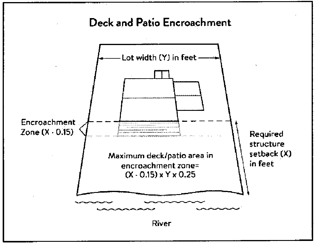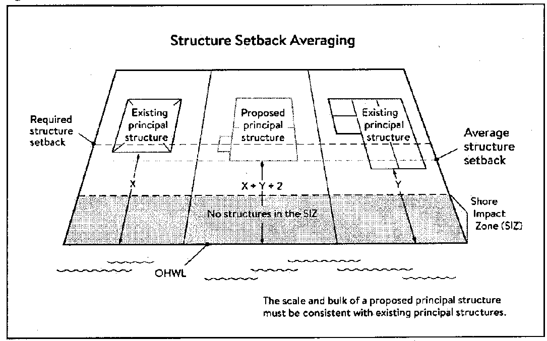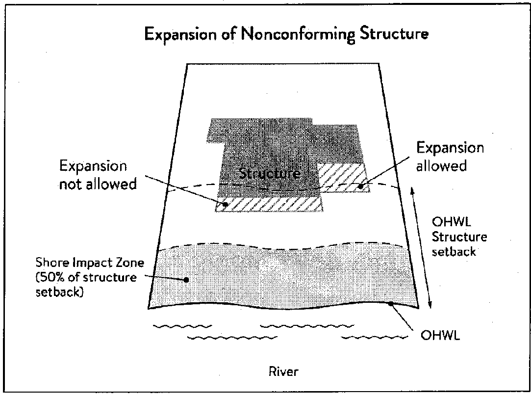 The expansion does not extend into the shore or bluff impact zone or further into the required setback than the building line of the existing principal structure (see Figure 5); and