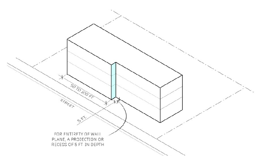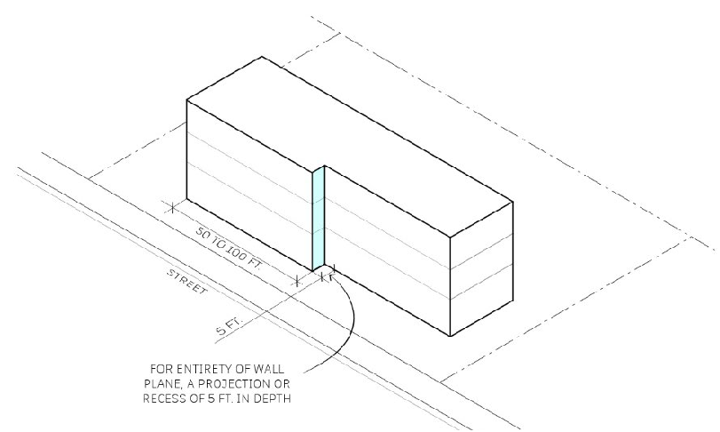 Façade break. Building facades with frontage along a street shall provide for the entirety of the wall plane a projection or recess of five feet in depth for every 50 to 100 feet of continuous horizonal length of building façade, as shown in Figure 17.48.040.1.