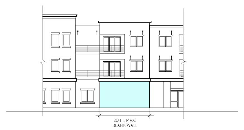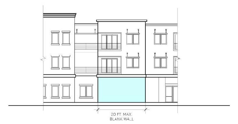 Blank façades. Blank building facades shall be prohibited. Building facades without the use of windows or doors shall not span a continuous horizontal length greater than 20 feet across any story, as shown in Figure 17.48.040.2.