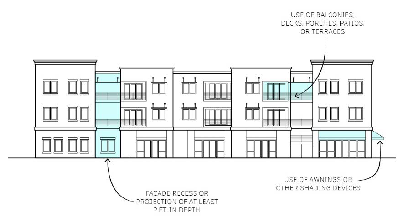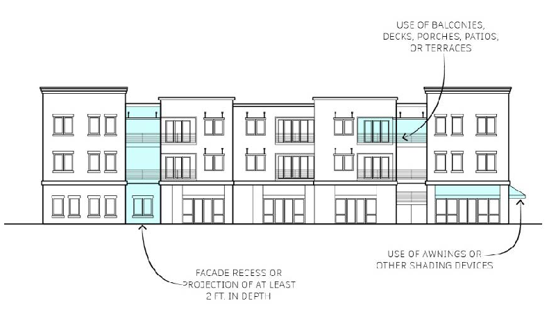 Façade modulation and articulation. Building facades facing a street shall incorporate at least one of the following design features for at least 25 percent of the façade area, as shown in Figure 17.48.040.3.