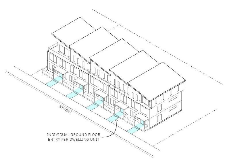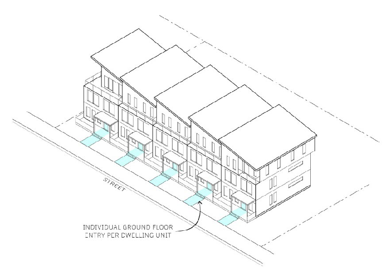 Ground floor dwelling units. Each at-grade ground floor dwelling unit facing a street shall have its own ground floor building entry that is visible from the street, oriented towards the street, and provides a pedestrian walkway to the sidewalk along the street, as shown in Figure 17.48.040.4.