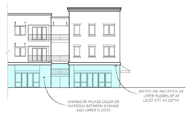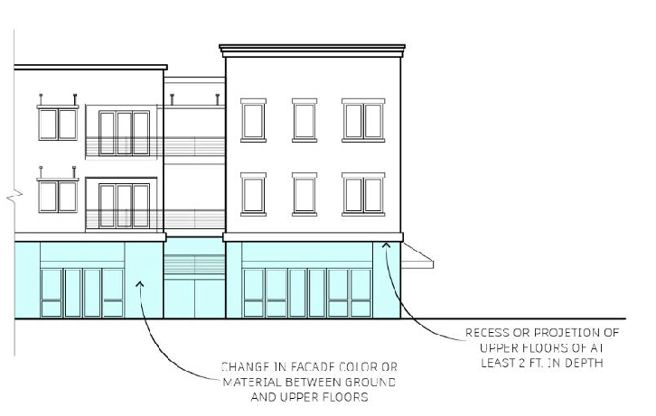 A change in façade material between the ground floor and the upper floors, where the ground floor is distinguished through the application of brick, stone, concrete masonry, or other distinct material as approved by the director.