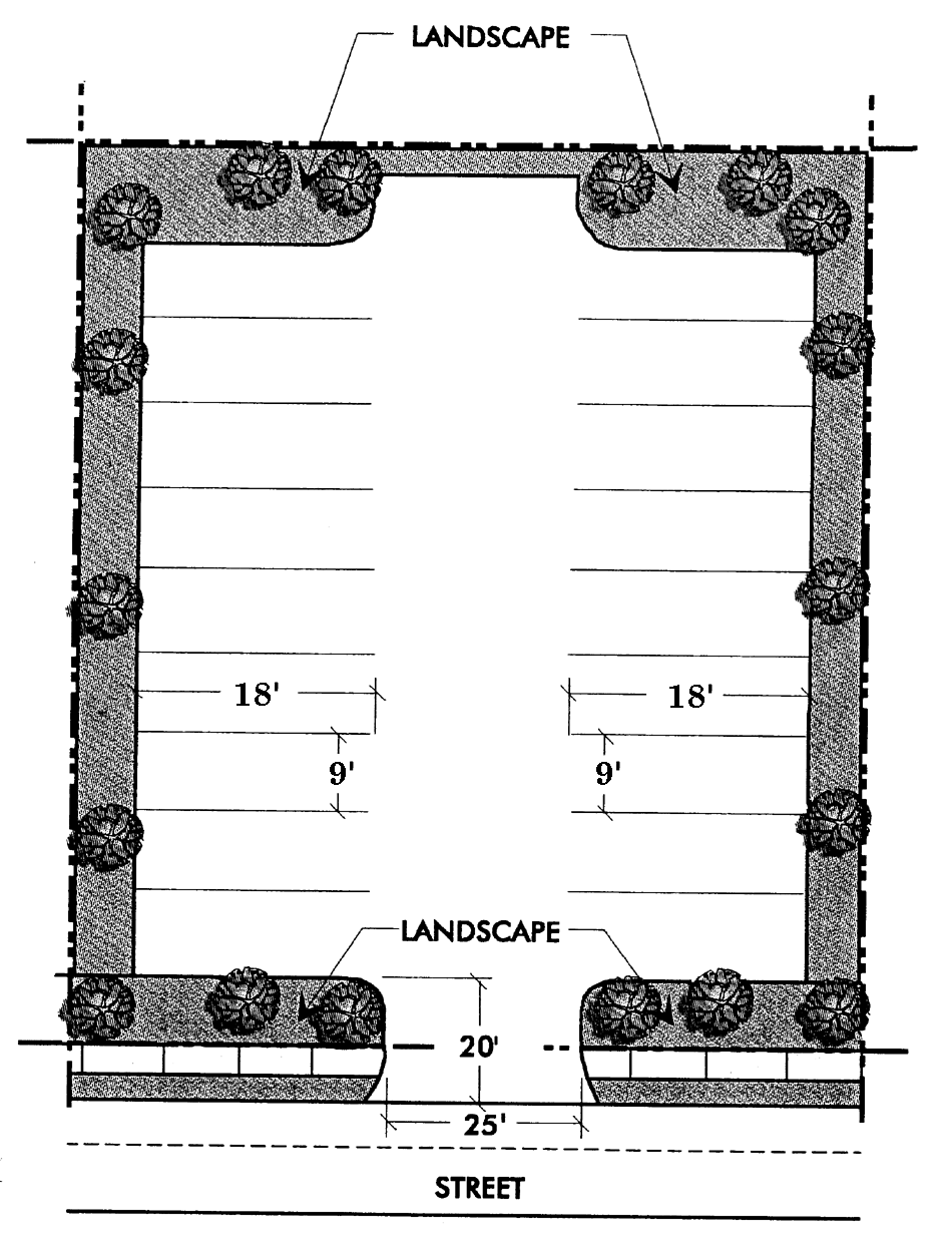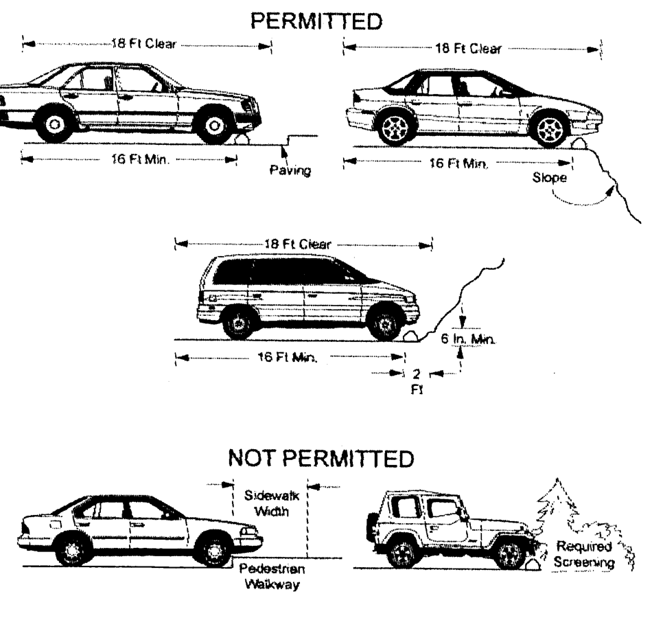 Curbs or tire stops shall be provided at the end of each uncovered parking space along any property line abutting a public walkway, street or alley, except where screening is positioned, to ensure that the motor vehicle will not encroach into the public right-of-way as illustrated in Figure 9.06.2.