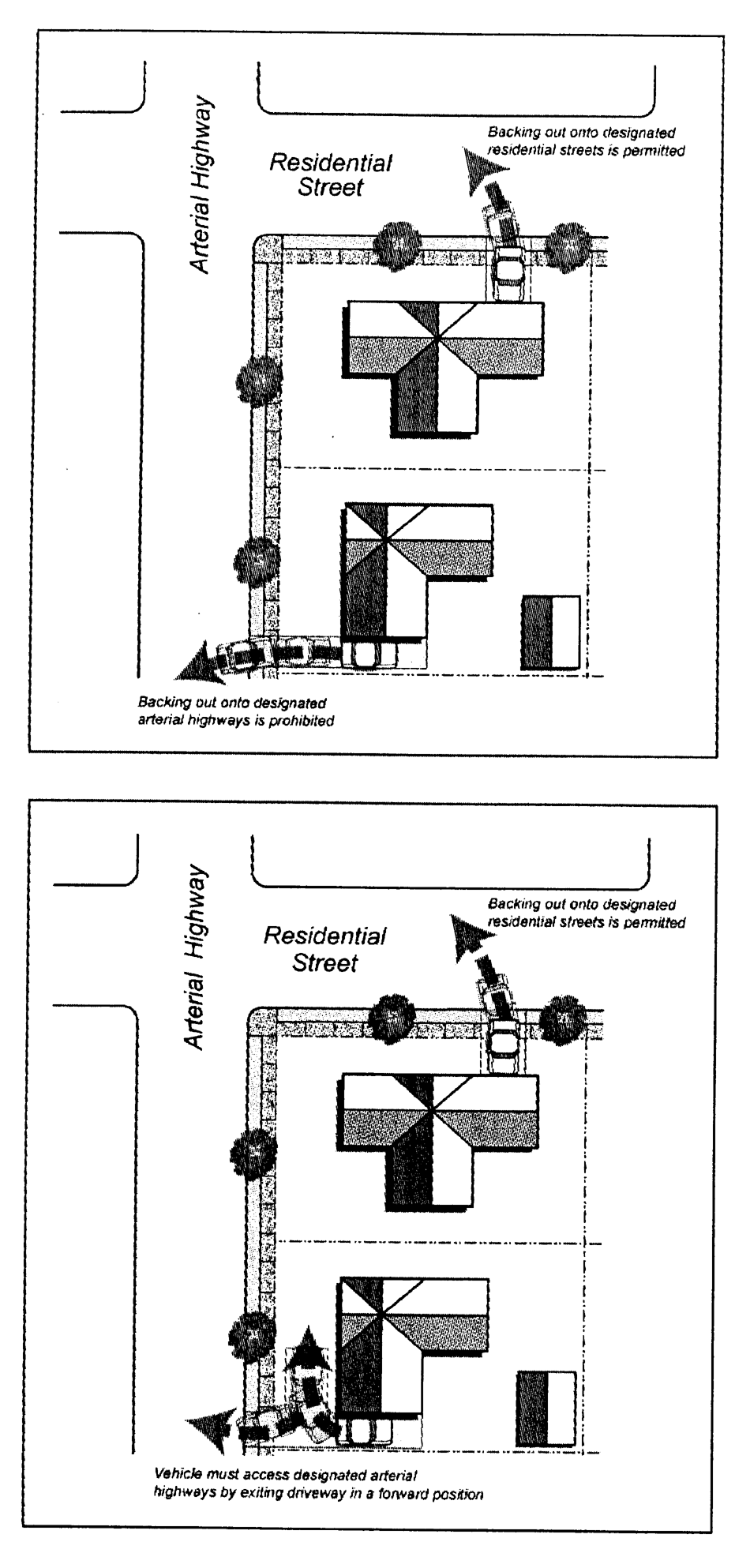 Wherever access from a parking area is to an arterial highway as designated in the General Plan circulation element, parking spaces, driveways and maneuvering areas shall be designed so that motor vehicles must enter the arterial highway while traveling in a forward direction.