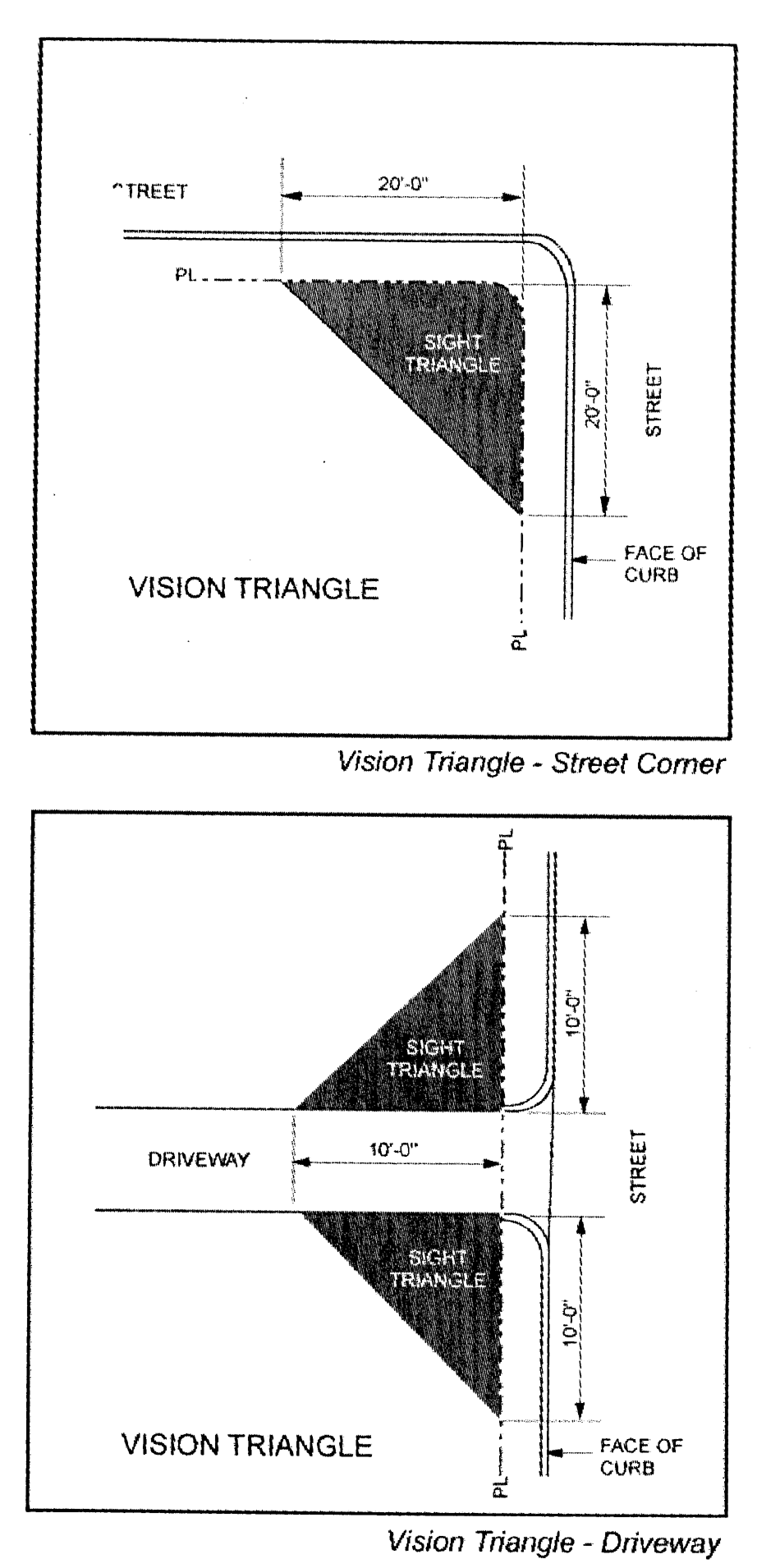 Driveway visibility. In any zoning district, no fence, wall, hedge, or other barrier shall be erected, placed, planted, or allowed to grow above a height of 36 inches so as to materially impede vision in the triangular area on the parkway side of the curb, located on both sides of a driveway entrances as shown in Figure 9.06.5.