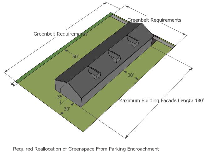 Each square foot of pavement which encroaches into a required setback must be replaced on another side of the same building. Site plans must clearly dimension landscaped greenbelts and provide calculations in instances of setback transfer.