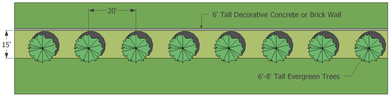 If the Planning Commission determines that a natural landscape buffer is not acceptable or that another form of screening may provide a better screening scenario, a six (6') foot tall poured decorative concrete or decorative brick wall may be approved.