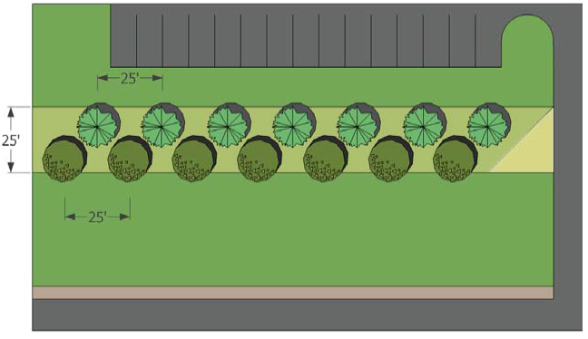 Shall be planted at a rate of one (1) tree for each twenty five (25) feet of frontage.