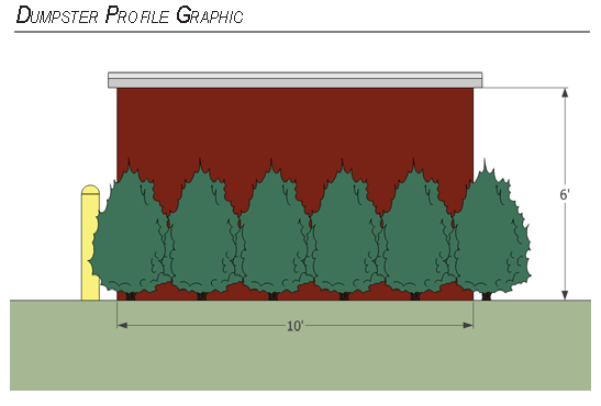 All trash receptacles shall be screened on three (3) sides by durable masonry walls which are similar to, or compatible with, the exterior construction materials used elsewhere on site. The height of the masonry screening shall be six (6') feet. The walls shall be constructed of either color impregnated poured concrete with a simulated brick pattern or decorative clay brick, the same as that used for the principle building. The dumpster enclosure shall not be painted. Further, the trash receptacle enclosure shall be complemented with evergreen and other decorative plantings that provide a continuous screen.