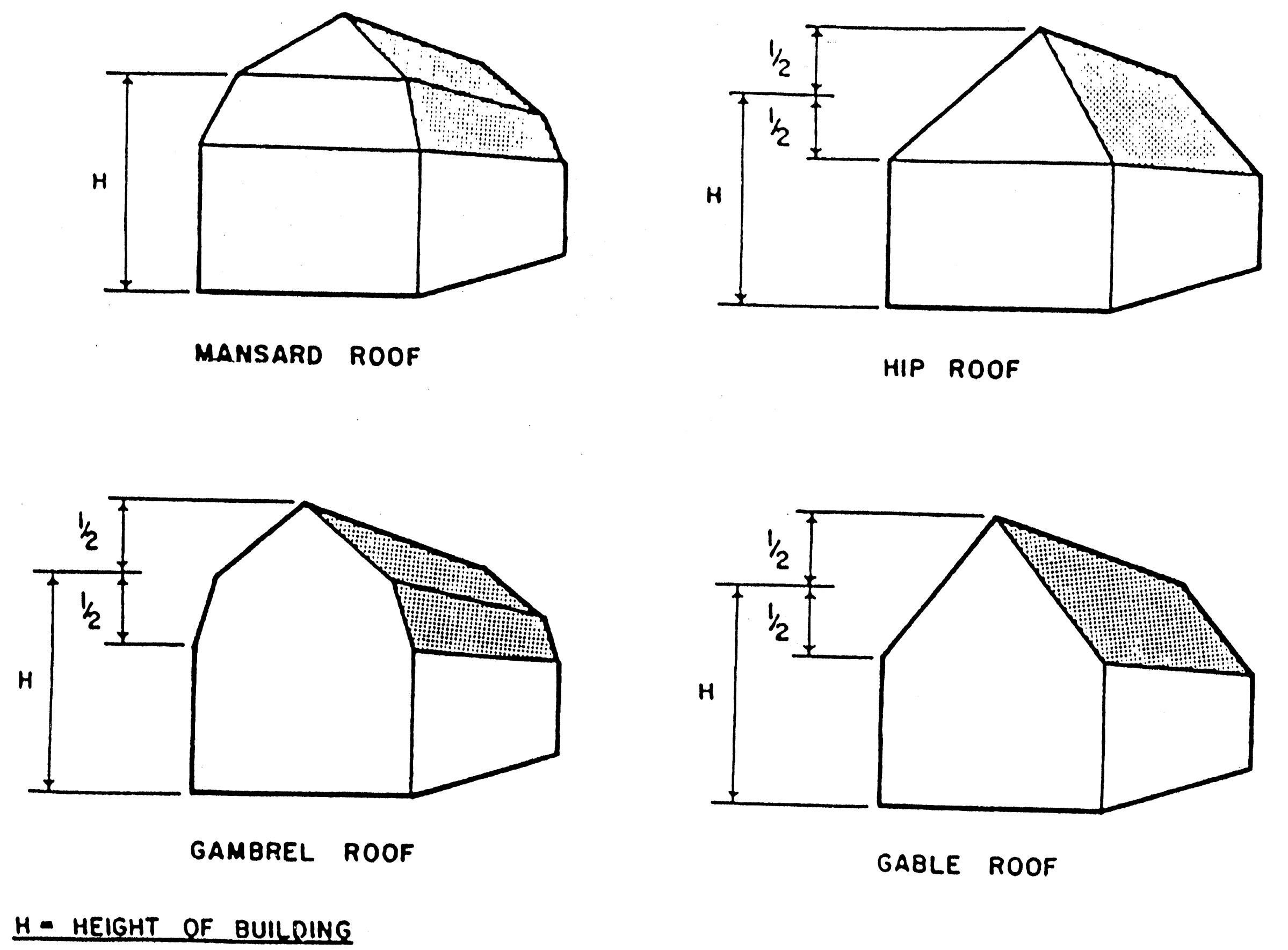 BUILDING HEIGHT: Is the vertical distance from grade to the top of parapet wall in the case of a flat roof, to the deck line for mansard roofs, to the mean height level between eaves and ridge for gable, hip, and gambrel roofs. The height of detached accessory structures shall be the distance from grade to the top of parapet wall in the case of a flat roof, and to the peak of the roof for mansard, gable, hip, and gambrel roofs. (Effective November 14, 1991)