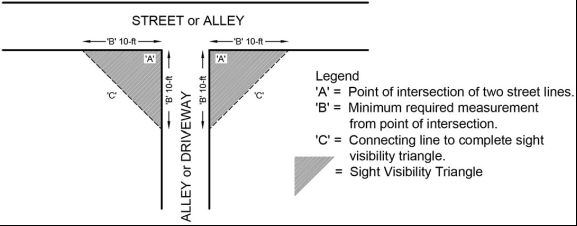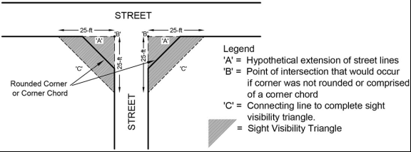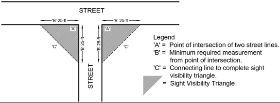 All uses and structures other than those listed in subsection B. above. The exterior portion of all required yards abutting public streets, with the exception of necessary entrance driveways and walks, shall be maintained in permeable landscaped vegetative green space to the minimum depth as established according to the following table or to the minimum yard (building setback) requirements (depth and width), whichever requirement is lower.