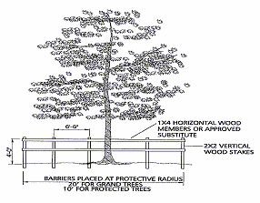 Prior to any land preparation or other development activities, a protective barrier easily visible to equipment operators shall be placed around all protected trees so as to encompass the entire tree protection zone. See Figure 90-166-A.
