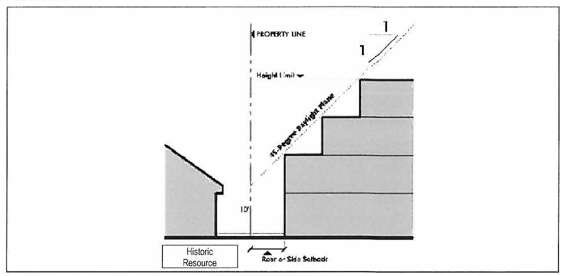 Upper-Story Stepback. Buildings shall not intercept a 45-degree daylight plane inclined inward from fifteen (15) feet above existing grade at the property line of the parcel adjacent to property line of an adjacent property containing public open space or an historic resource.