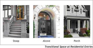 Transitional Space at Residential Entries. New residential buildings shall provide transitional spaces in the form of stoops, overhangs, and porches between public areas fronting the primary street and entrances. This type of element or equivalent shall be required for each unit or group of units; but no less than one (1) of this type of element shall be provided.