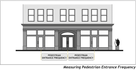 Pedestrian Entrance Frequency. At street frontages, ground-related entrances shall occur at least once every one hundred (100) feet, as measured along the front property line. Ground-related entrances include entrances to ground-floor uses, residential units, clusters of live/work units, lobbies, or private courtyards. Retail-related uses shall have ground-related pedestrian entrances that occur at least once every fifty (50) feet. Buildings with a single tenant on the ground floor may have an alternative pedestrian entrance frequency where other design treatments or articulations are used to maintain visual interest and sense of security for pedestrians including, but not limited to, windows, wainscots, decorative light sconces, statuary, bas relief panels, and murals with the approval of the Community Development Director or his/her designee.