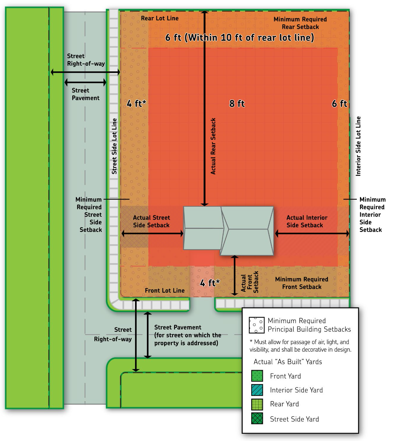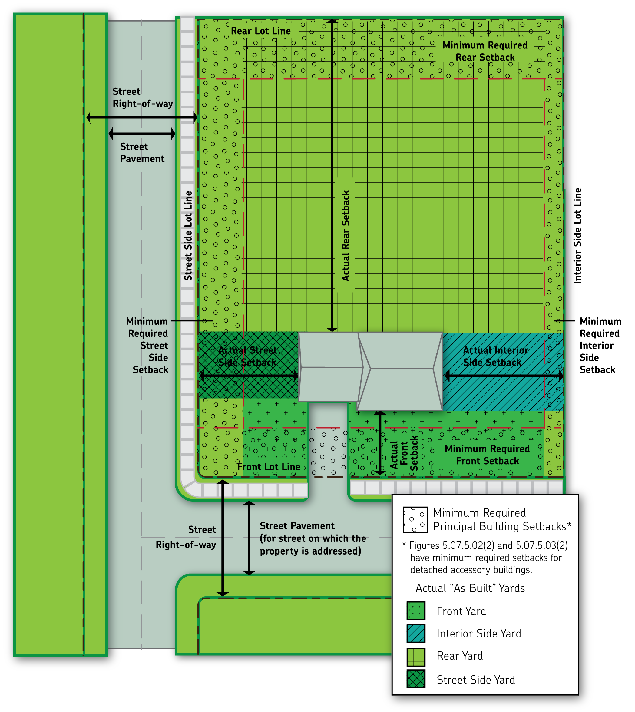 Yard, street side means, for corner lots, the land area between the front and rear lot line extending from a street side lot line to the nearest part of the nearest principal building on the lot.