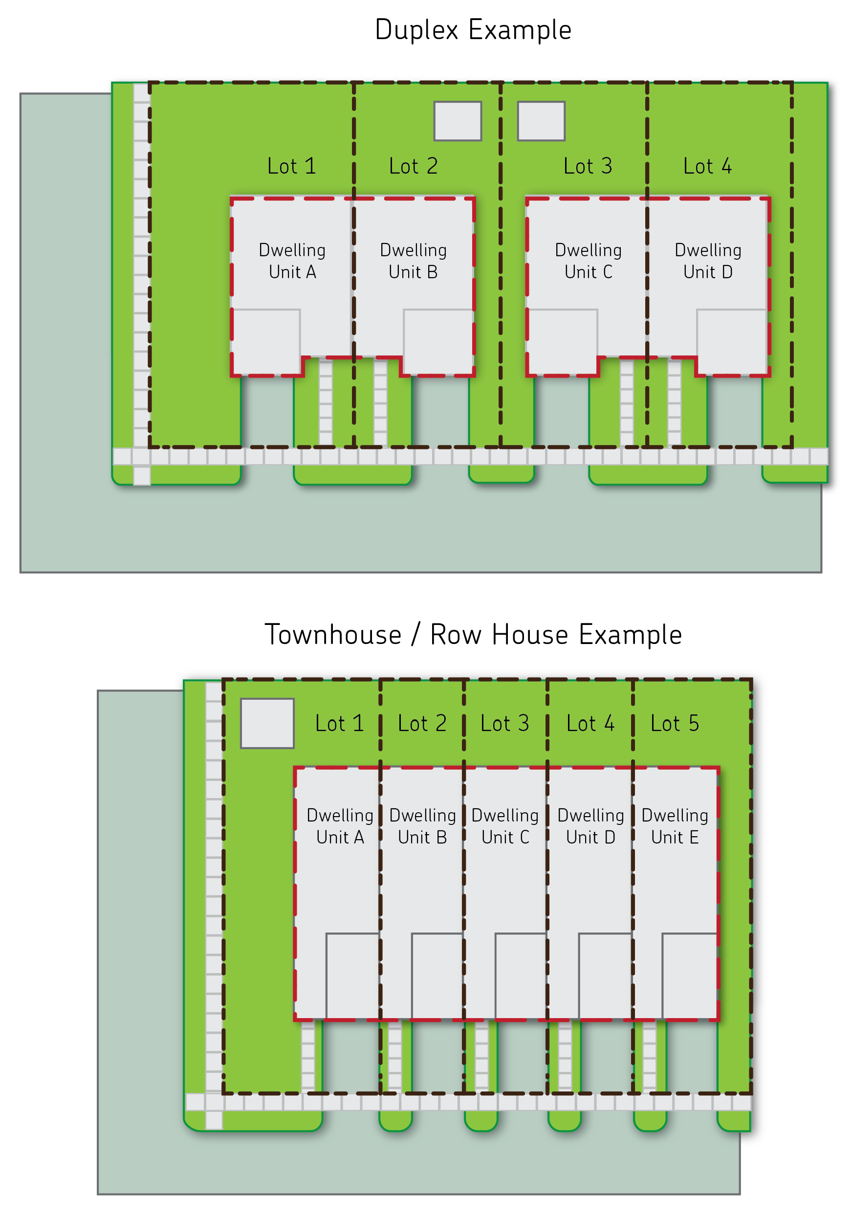 Zero lot line duplex means a type of duplex building and zero lot line structure containing two separate dwelling units constructed side-by-side, with each unit located on a separate lot, having a private individual exterior access, and no shared internal access within the building.