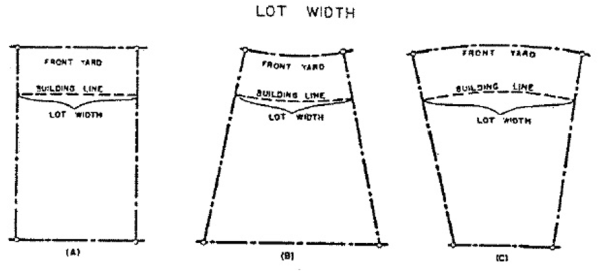 Lot Width - The horizontal distance between side lot lines measured along a line that is parallel to the front lot line. For irregular-shaped lots, the distance at front and rear setbacks can be averaged.