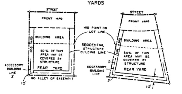 Yard Side - The area between the building and side line of the lot and extending from the front lot line to the rear lot line and being the minimum horizontal distance between a side lot line and the outside wall of the side of the main building.