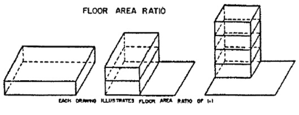 Floor Area Ration (FAR) - An indicated ration between the number of square feet of total floor area in the main building(s) on a lot and the total square foot of land in the lot; it is the number resulting from dividing the main building floor area by the lot area. (See Appendix Illustration 15.)