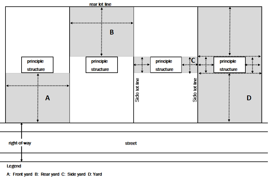 Front yard. The area extending across the full width of a lot the depth of which shall be the perpendicular distance between the existing or proposed road right-of-way or and the principal structure. (See Figure 10, Yard Terms.)