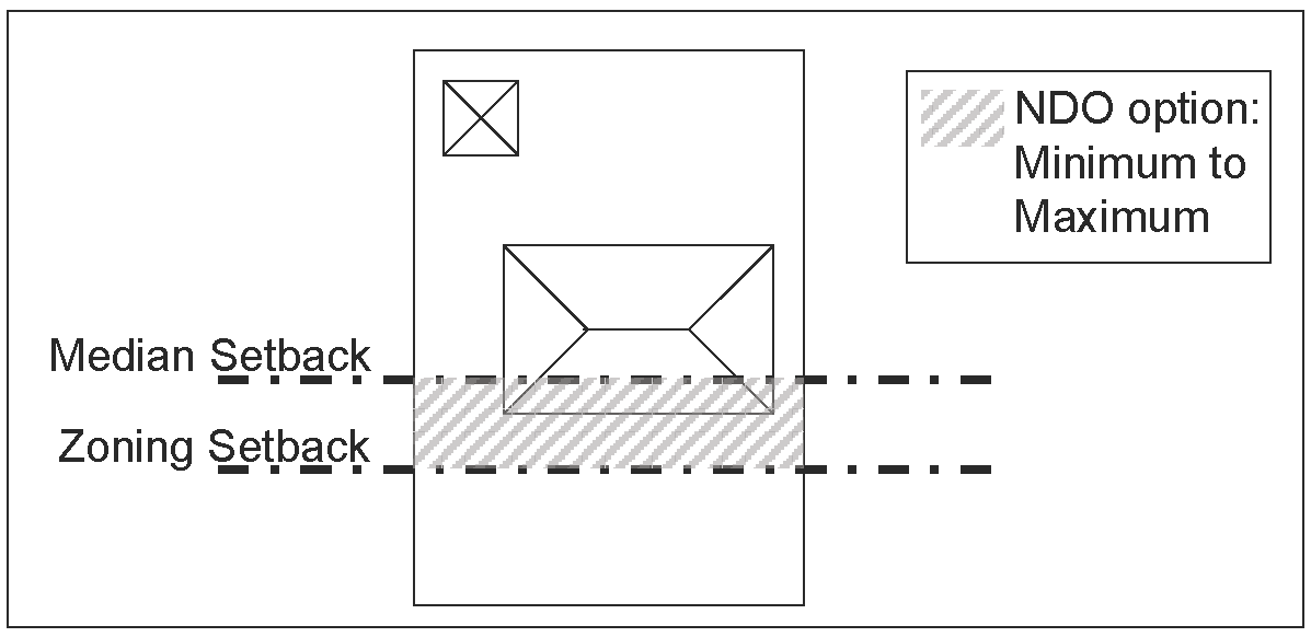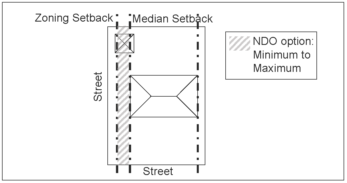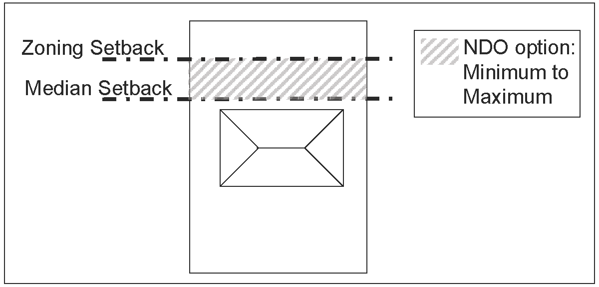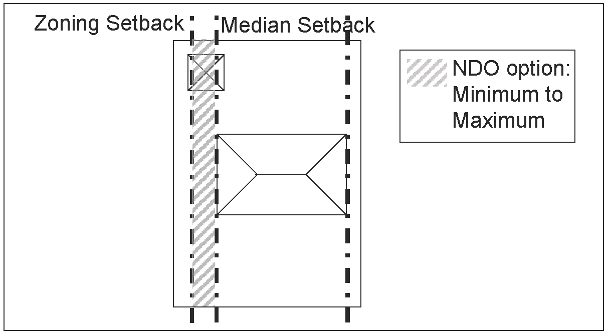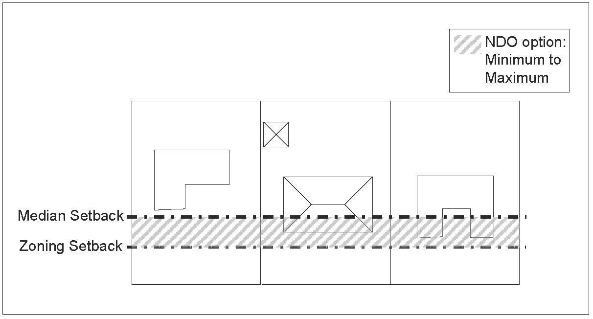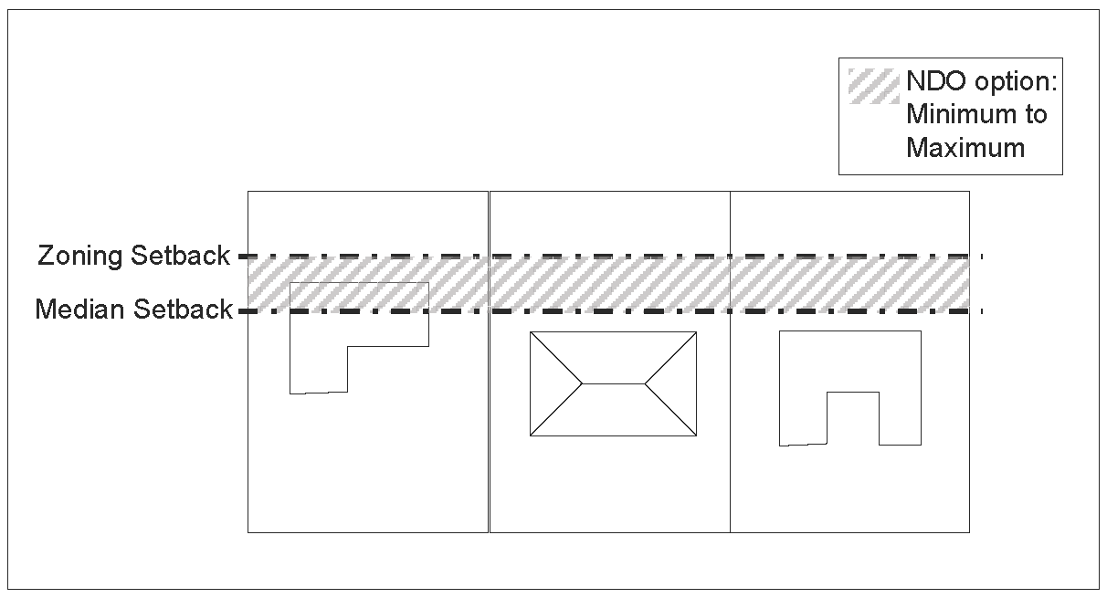 Front setback. The minimum front setback must be within the range between the setback of the underlying zoning district regulations and the median front setback of the single-family structures within the district. This range may require a front setback that is greater than the front setback in the underlying zoning. For example, if the minimum front setback of the underlying zoning district regulations is 30 feet and the median front setback of single-family structures within the district is 40 feet, the minimum front setback selected for the overlay district must be between 30 feet and 40 feet as illustrated in Figure 1 and Figure 1a below.
