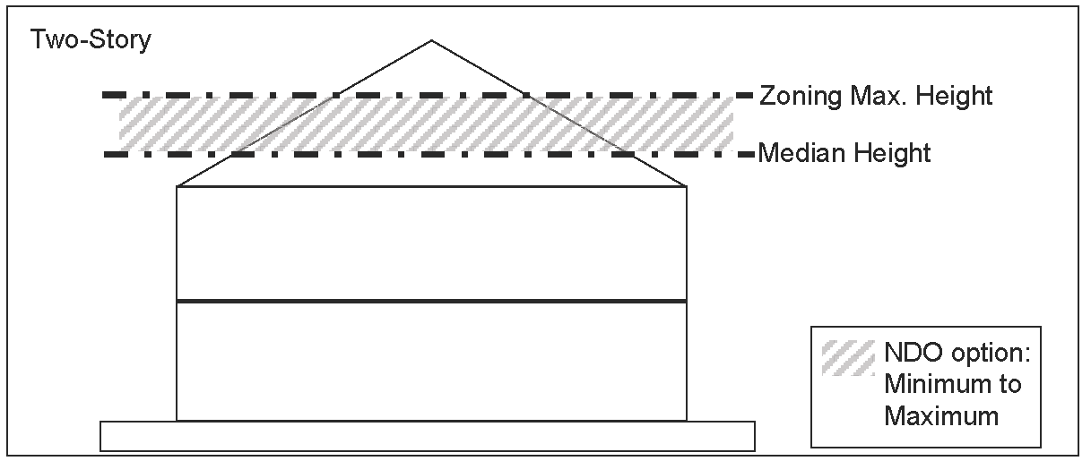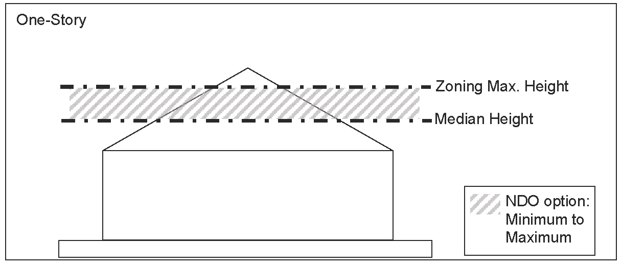 Height for single-story or two-story neighborhoods. For a district consisting of entirely existing single-story single-family structures, the maximum height of single-family structures must be within the range between the maximum height of the underlying zoning district regulations for single-family structures and the median height of the single-story single-family structures within the district. For example, if the maximum height of a single-story single-family structure in the underlying zoning district regulations is 25 feet, and the median height of the single-story single-family structures within the district is 20 feet, the maximum height of a single-family structure selected for the overlay district must be between 25 feet and 20 feet as illustrated in Figure 5 below. For a district consisting of entirely two-story single-family structures, the maximum height of single-family structures must be within the range between the maximum height of the underlying zoning district regulations for two-story single-family structures and the median height of the two-story single-family structures within the district. For example, if the maximum height of a two-story single-family structure in the underlying zoning district regulations is 40 feet and the median height of the two-story single-family structures within the district is 35 feet, the maximum height of a single-family structure selected for the overlay district must be between 40 feet and 35 feet as illustrated in Figure 5a below.