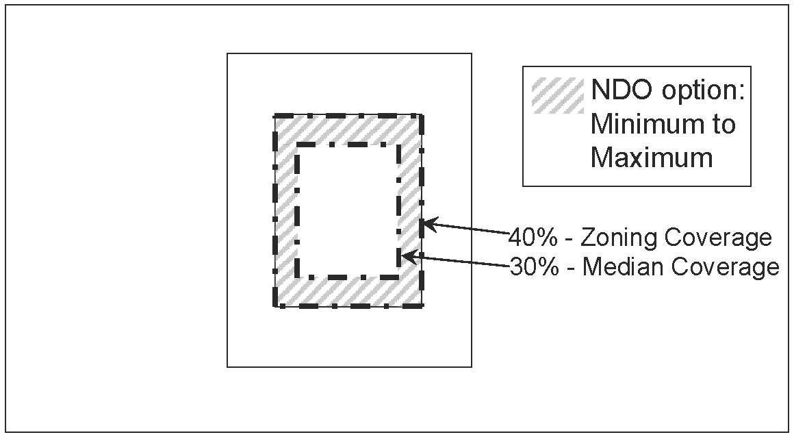 Lot coverage. The maximum lot coverage selected for a district must be within the range between the maximum lot coverage of the underlying zoning district regulations and the median lot coverage for the single-family structures within the district. For example, if the maximum lot coverage in the underlying zoning district regulation is 40 percent and the median lot coverage for the single-family structures within the district is 30 percent, the maximum lot coverage selected for the overlay district must be between 40 percent and 30 percent as illustrated in Figure 6 below.