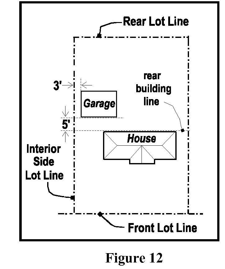 The interior side setback requirement for single-story accessory buildings located entirely five (5) or more feet beyond the rear building line of the principal building may be reduced to three (3) feet (Figure 12); and