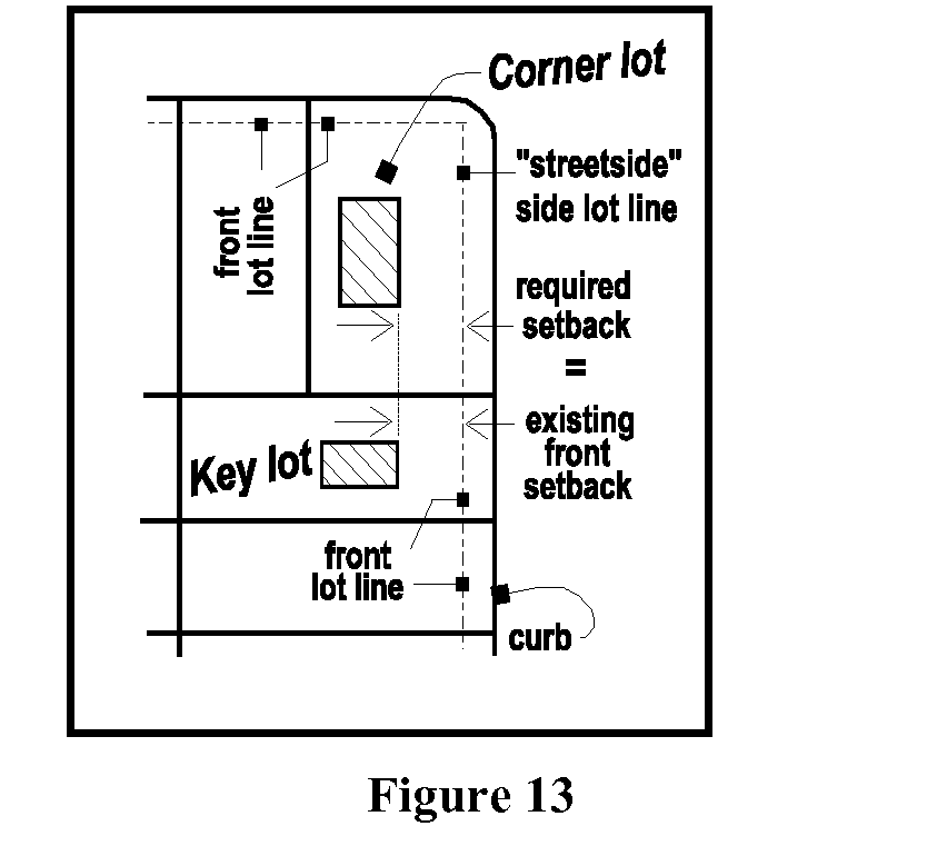Subd. 5.Additional setback requirement: all structures located on a corner lot that abuts a key lot. On a corner lot which abuts a key lot, the street/corner side setback requirement of such corner lot shall be equal to the front setback of any existing principal building on the key lot or 30 feet, whichever is less, however, in no case shall such street side setback requirement be less than 15 feet. (Figure 13)