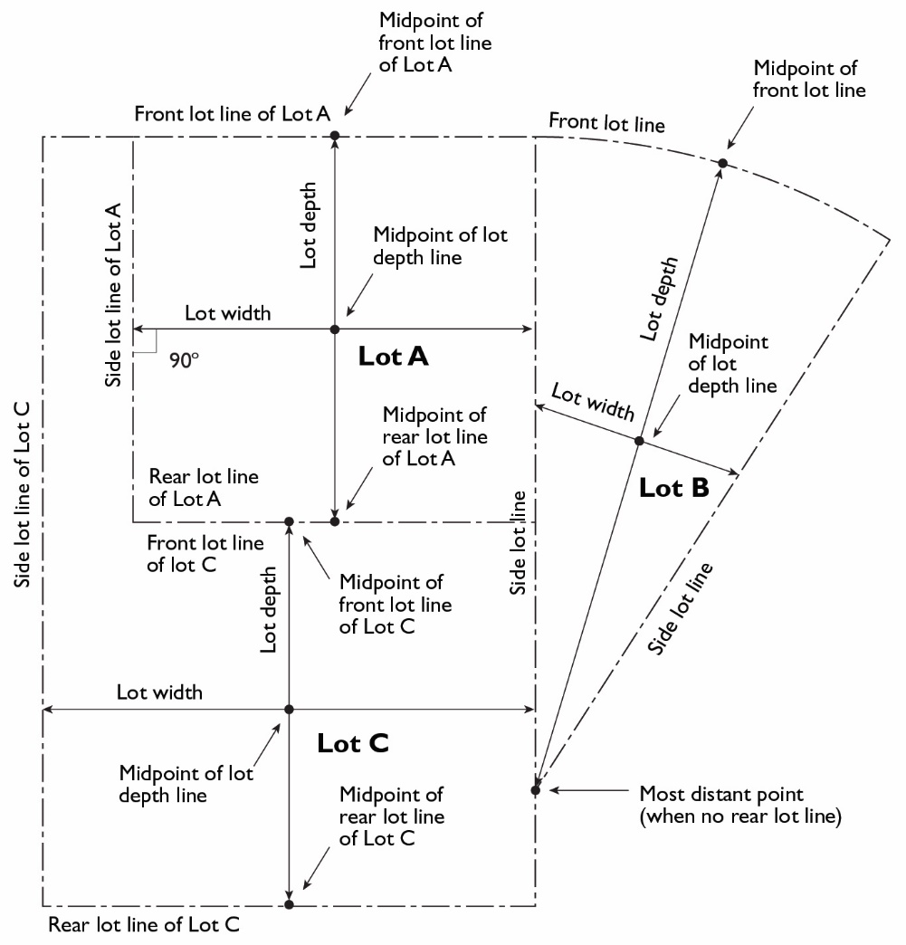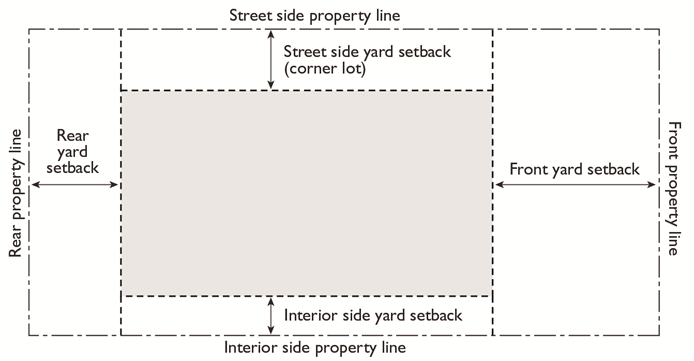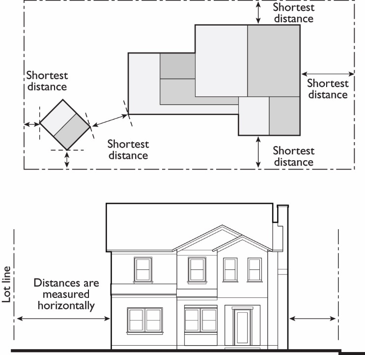 Measurements are Shortest Distance. When measuring a required distance, such as the minimum distance between a structure and a lot line, the measurement is made at the closest or shortest distance between the two objects.