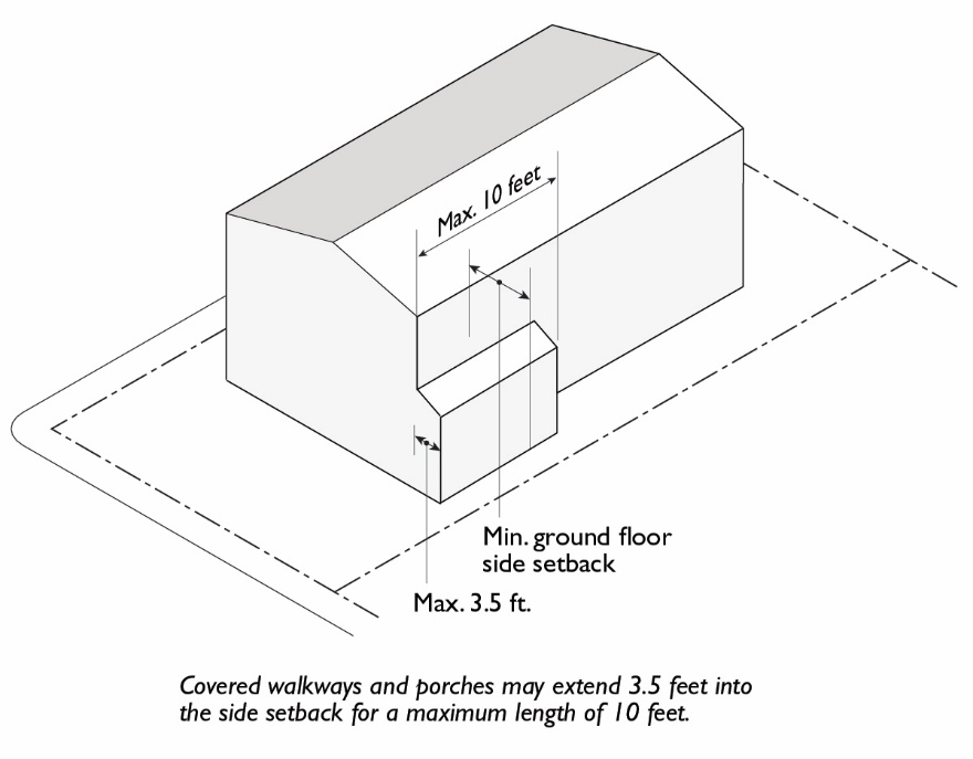 Side Setback Projection. Covered walkways, porches, and verandas may project up to 3.5 feet into the required side setback for a maximum length of 10 feet.