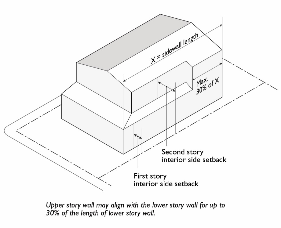 Second Story Projection. On lots less than 45 feet in width, the upper story wall may project a maximum of four feet into the required second story setback for up to 30 percent of the length of the lower story wall.