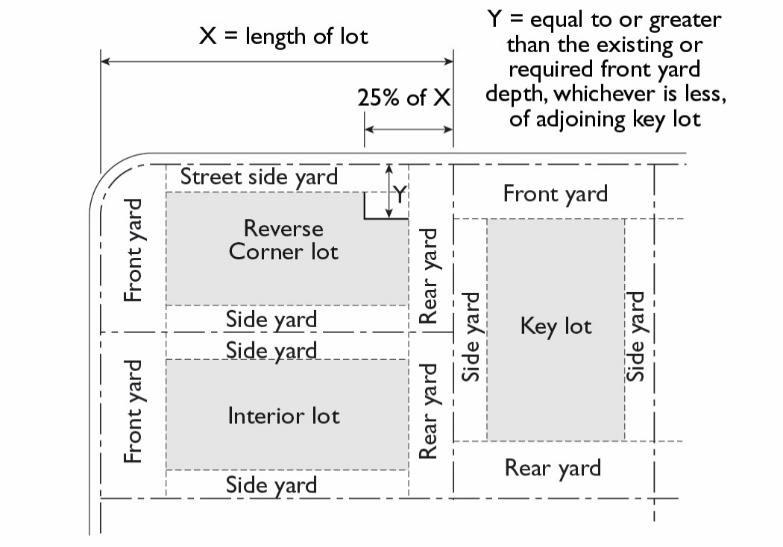 Street Side Yards on Lots with Reversed Frontage. The rear one-quarter of the exterior side yard shall not be less than the front yard required or existing on the lot adjoining such exterior side yard.